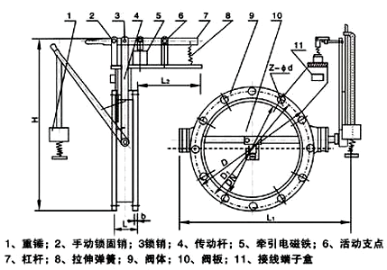 煤气快速安全切断阀是一种安全保护阀。是防止煤气系统因低压、停电发生重大事故的有效安全装置。该阀由密封性能良好的蝶阀,电磁启动机构、锁定机构、重锤及重锤臂等部件组成。阀门开启时,重锤臂处于竖立位置。电源接通,重锤臂被锁定机构锁定,管道正常输气。当管道内介质压力低于规定值或系统出现异常须立即切断介质时,可通过相应的回路使电磁机构断电,解除锁定。重锤臂及阀板在重力的作用下,依顺时针方向落下,阀门关闭。当需要恢复供气时,将重锤臂连同重锤按逆时针方向转至升至似竖直位置,锁定机构复位,此时行程开关的接点闭合,电磁机构得电,重锤臂被锁定。阀门又是开启状态。该阀克服了目前国内常用的电动切断阀切断速度慢、控制复杂等缺点,而且在断电时也能立即切断煤气,保证生产安全。是以煤气为燃料的各种工业炉、窑生产安全不可缺少的理想设备。它具有结构简单、操作方便、工作可靠、切断速度快(≤1秒)和密封性能好等特点。广泛应用于煤气加热炉、煤气锅炉及各种工业燃气锅炉中。